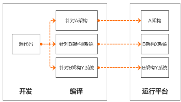 :使用针对特定 CPU 体系的编译器,将源代码(高级程序语言编写的代码)一次性的编译成目标代码(机器语言编写的代码)(源代码——机器码);程序运行时,直接运行编译好的目标代码;