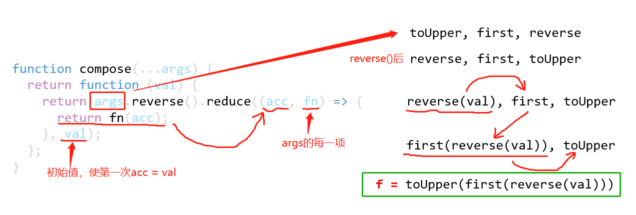 1 2 3 4 5 6 7 8 9 10 function compose (...args ) { return function (val ) { return args.reverse ().reduce ((acc, fn ) => { return fn (acc); }, val); }; }