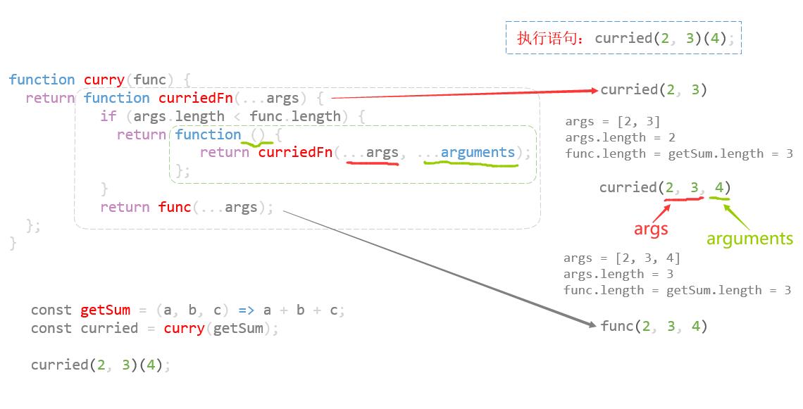1 2 3 4 5 6 7 8 9 10 11 12 13 14 15 16 17 18 19 20 function curry (func ) { return function curriedFn (...args ) { if (args.length < func.length ) { return function ( ) { return curriedFn (...args, ...arguments ); }; } return func (...args); }; } function getSum (a, b, c ) { return a + b + c; } const curried = curry (getSum);console .log (curried (2 , 3 )(4 )); console .log (curried (2 )(3 , 4 ));