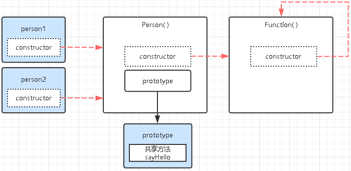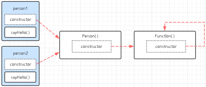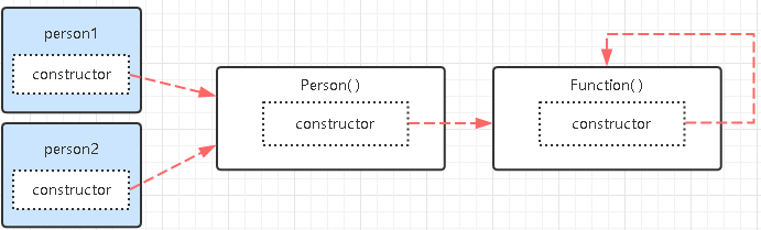 Person 函数是由 JS 内置函数 Function 函数实例化,Person.constructor === Function。而 Function 本身还是个构造函数,它的 constructor 是本身。