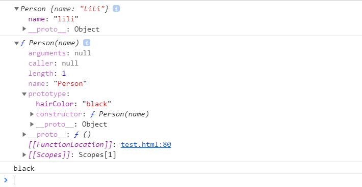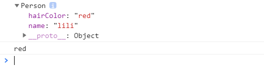 person1 被 Person 构造函数实例化,我们给这个 person1 加了属性 hairColor,这个时候 person1 上具有 hairColor 的(person1.hairColor = ‘red’),就是我们后来给他赋值的颜色,红色。打印如下: