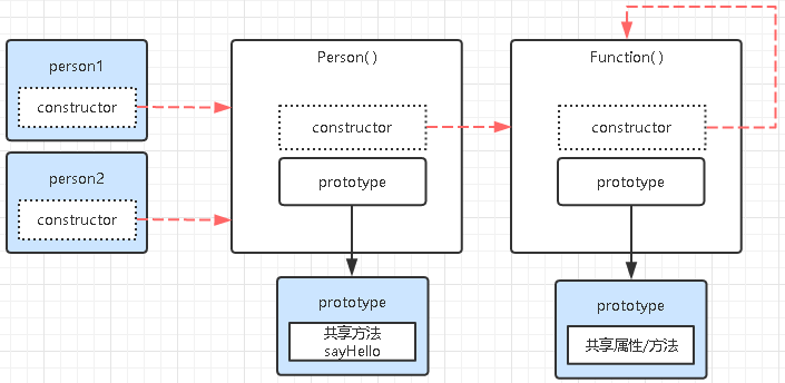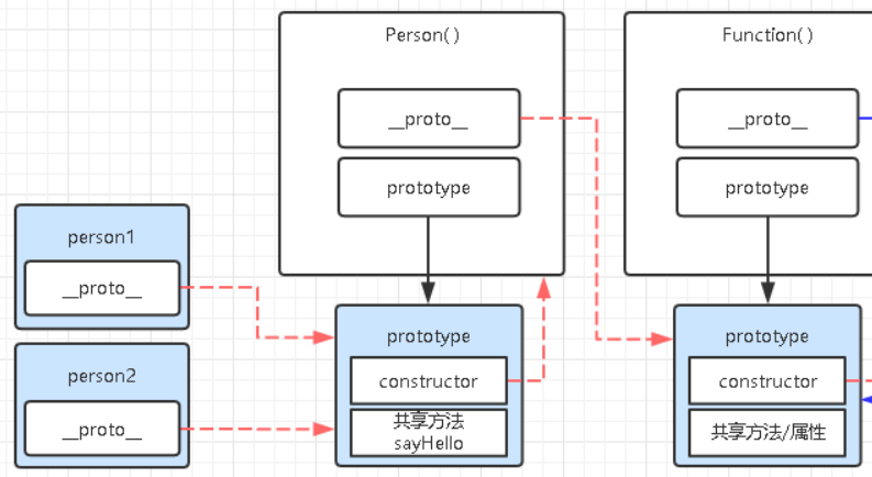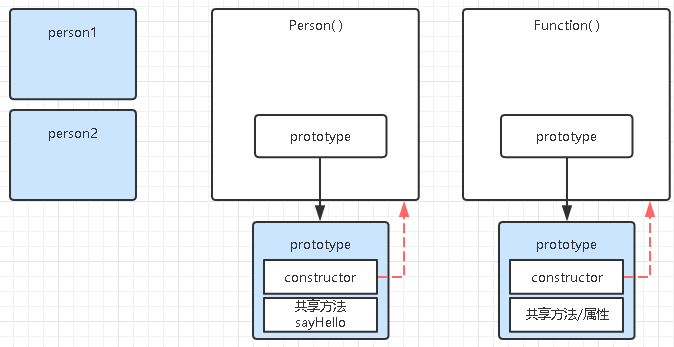 用上面的方法,可以解决内存浪费问题,所有共享属性和方法都放在 prototype 中,只需要开辟其相对应的内存,同时也能实现数据共享和继承。那么 Function 作为 Person 函数的构造函数,是不是也应该有个 prototype 属性,存放 Person 函数可以从 Function 那里共享的属性和方法呢。
