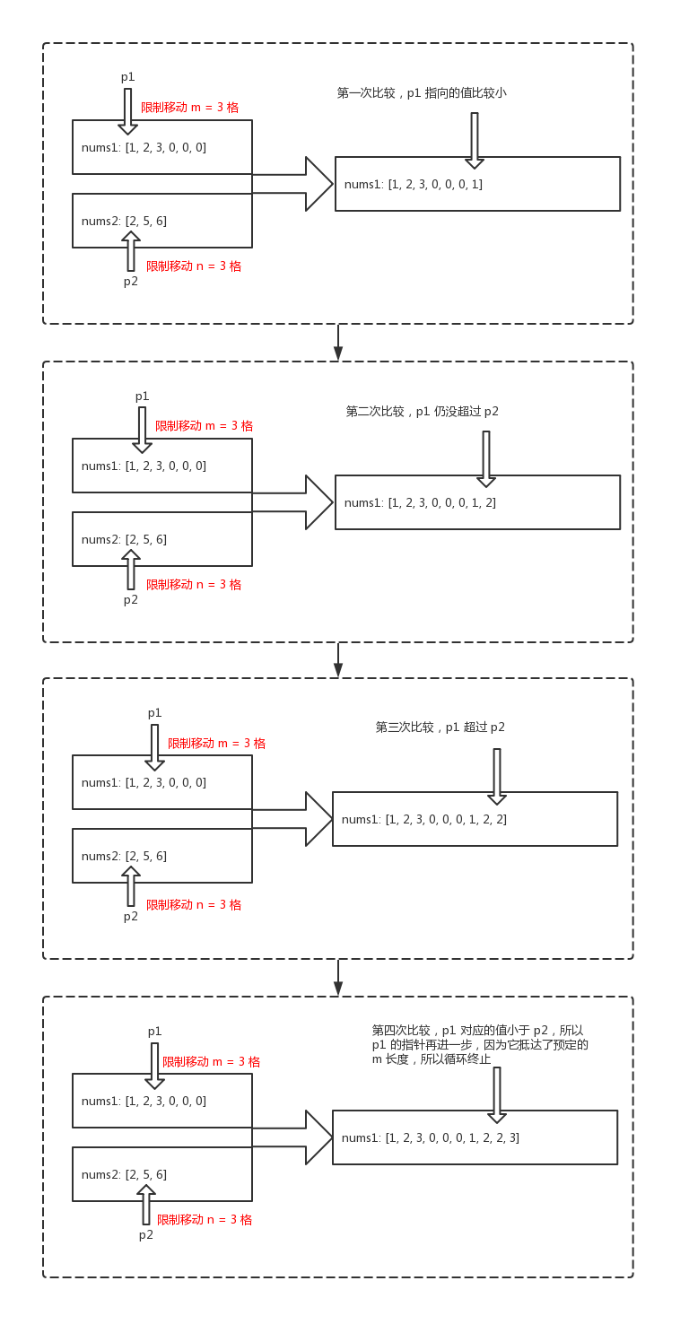 用 p1 对应的值和 p2 进行比较,将最小的值放入都输出数组中。每次比较,移动对应的 p1 或者 p2:
